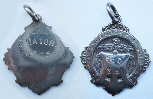 The three group football pictures were kindly lent to us by Val Harman. Her father, Fred Mason, appears in the 1922 - 1923 and 1923 - 1924 team pictures. He received medals for being in the winning teams in both of those years. The illustration shows both sides of his 1923 - 1924 medal.