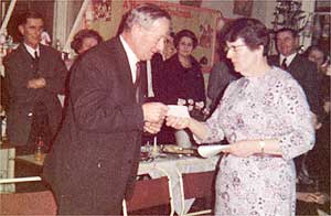 Retirement of Maurice Harvey (1967). Miss Norah Smith, Deputy Head, presenting a cheque to Mr Maurice Harvey (Headmaster) on his retirement (he bought a greenhouse). The Governors (or Managers, as they were called then) in the background include Frank Goldstraw.Mrs Jean James lent us this photograph.