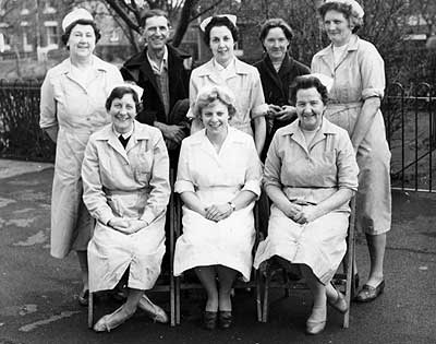 Back row left to right: Ve.Martin, Roy Hall (caretaker), Mrs Hartwell, Mrs Clovelly, Mrs Enstone;